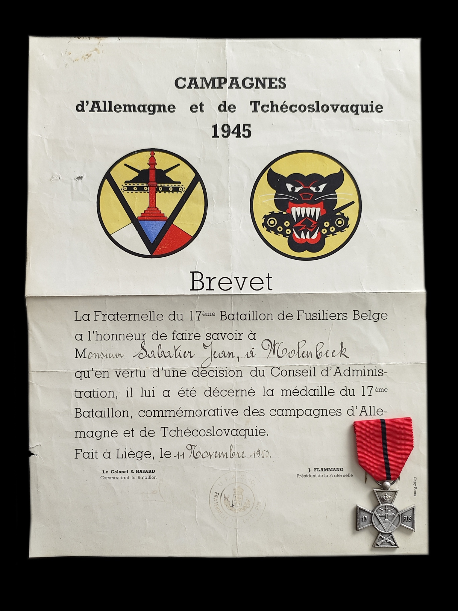 Dekret a medaile pro příslušníka 17. střeleckého praporu Jeana Sabatiera z Molenbeeku za účast na osvobození Československa.